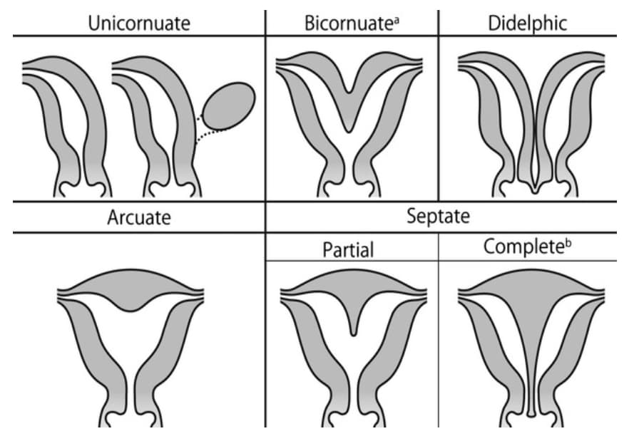 - Διθάλαμη μήτρα, όπου η παρουσία ενός διαφράγματος χωρίζει σε άλλοτε άλλο βαθμό την κοιλότητα της μήτρας στα δύο